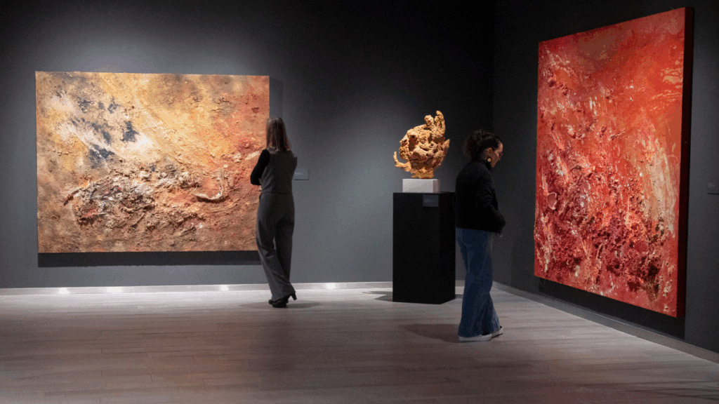 El recorrido por la sala permite establecer una conexión entre diferentes ideas: el uso múltiple de materiales naturales (tierra, arena, pigmentos, minerales, cera, óxidos, sal, cenizas…) que conectan con el entorno y el territorio; la relación entre cuerpo y gesto, con materia que no solo se aplica, sino que se manipula con el cuerpo; y la temporalidad con las superficies rugosas y erosionadas que evocan procesos geológicos o marinos como la sedimentación o la erosión.