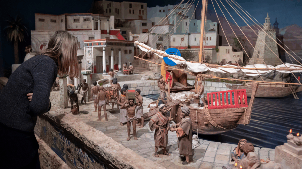 Las figuras, de barro cocido y ropajes inspirados en ilustraciones de William Hole y William Barclay, representan con fidelidad la vida cotidiana de hace más de 2.000 años. La escenografía se divide en tres grandes escenarios —Nazaret, Belén y Egipto— reconstruidos con precisión histórica, desde las casas blancas de piedra hasta la vegetación, herramientas, juegos y elementos arquitectónicos de la época.