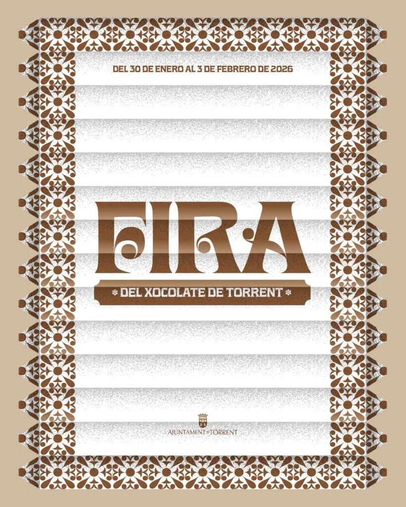 El Ayuntamiento de Torrent ya ha desvelado el cartel oficial de esta III edición de la Feria del Chocolate, una obra del diseñador torrentino Adrián Herreros. El cartel está inspirado en los envoltorios tradicionales del bollo de chocolate de Torrent, un guiño a la memoria colectiva y a los fabricantes históricos de la ciudad. Con esta imagen, el consistorio refuerza la identidad visual de la feria y su estrecha relación con la tradición chocolatera local, proyectando al mismo tiempo una imagen moderna y atractiva de Torrent.