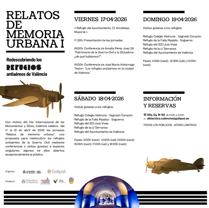 La primera de las propuestas tendrá lugar mañana viernes en el refugio del Ayuntamiento de Valencia, que acogerá una tarde de conferencias especializadas dedicadas a reflexionar sobre el valor histórico, arqueológico y patrimonial de estos lugares de memoria. Bajo el título “Relatos de memoria urbana: Redescubriendo los refugios antiaéreos de València”, se ofrece una propuesta “para acercarse al patrimonio de la Guerra Civil mediante la visita a algunos de los espacios más singulares de la ciudad, algunos abiertos de forma excepcional al público”, tal como han subrayado sus promotores. Participarán personas especialistas en historia y arquitectura, que abordarán la conservación, interpretación y significación de los refugios en el contexto de la Guerra Civil en Valencia.