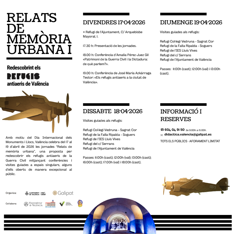 Durante todo el fin de semana, la programación continuará con visitas guiadas a otros refugios antiaéreos de la ciudad, que se llevarán a cabo en grupos reducidos y siempre bajo reserva. Se visitarán los refugios ubicados en la calle de los Serranos, en el Instituto de Educación Secundaria, IES, Lluís Vives, en la Falla Ripalda-Sogueros, en el Colegio Vedruna – Sagrado Corazón y el propio refugio del Ayuntamiento. Las actividades están abiertas a todos los públicos, con aforo limitado. Las personas interesadas pueden confirmar su asistencia en el teléfono 604 04 91 50 o en la dirección electrónica [email protected] (de 9:00h a 15:00 horas).